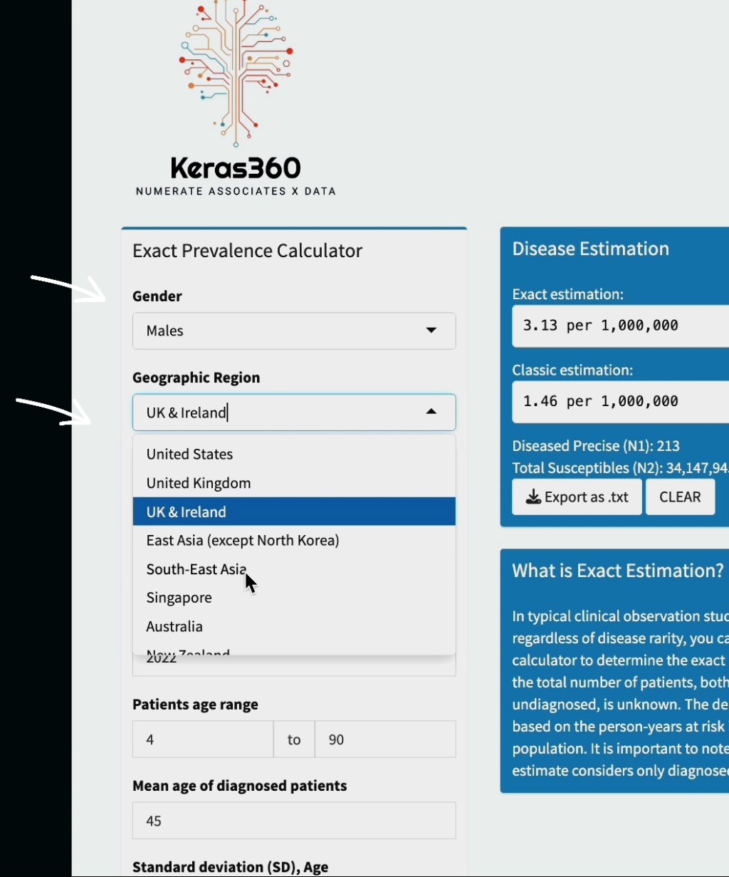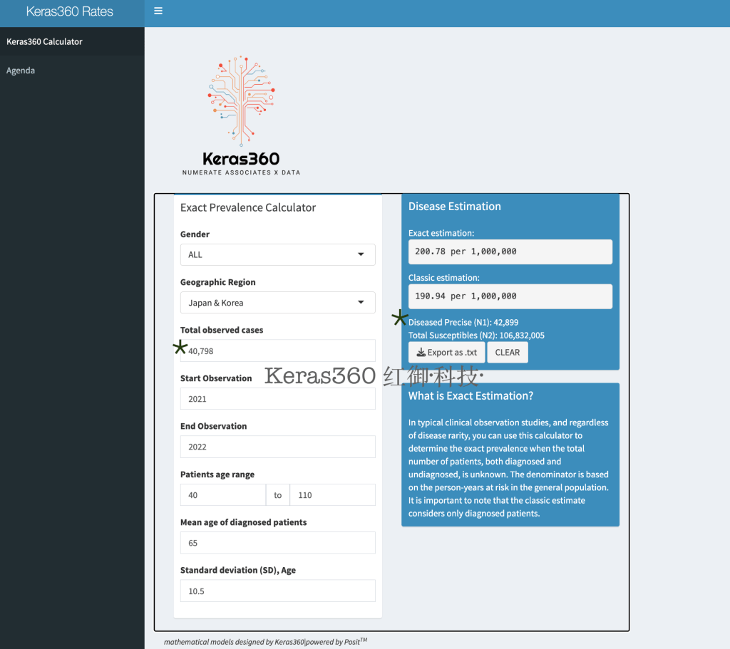 在2023年,Keras360开发了一种新的协议 ,用于重新评估疾病发生率 【请参考以上视频:前列腺癌症 与 三步攻略里的罕见疾病】。该方法依赖于风险人群和患者人口特征。Keras360 计算器 可使用于 : 1) 数据和样本量有限情况: 罕见疾病或个体病患数据不完善,2) 但是含有一些关于疾病的参数。这包括患者们年龄的基本描述性统计,如均值和标准差,为了进一步优化精度,观察到的患者的最小和最大年龄范围将是有益的。