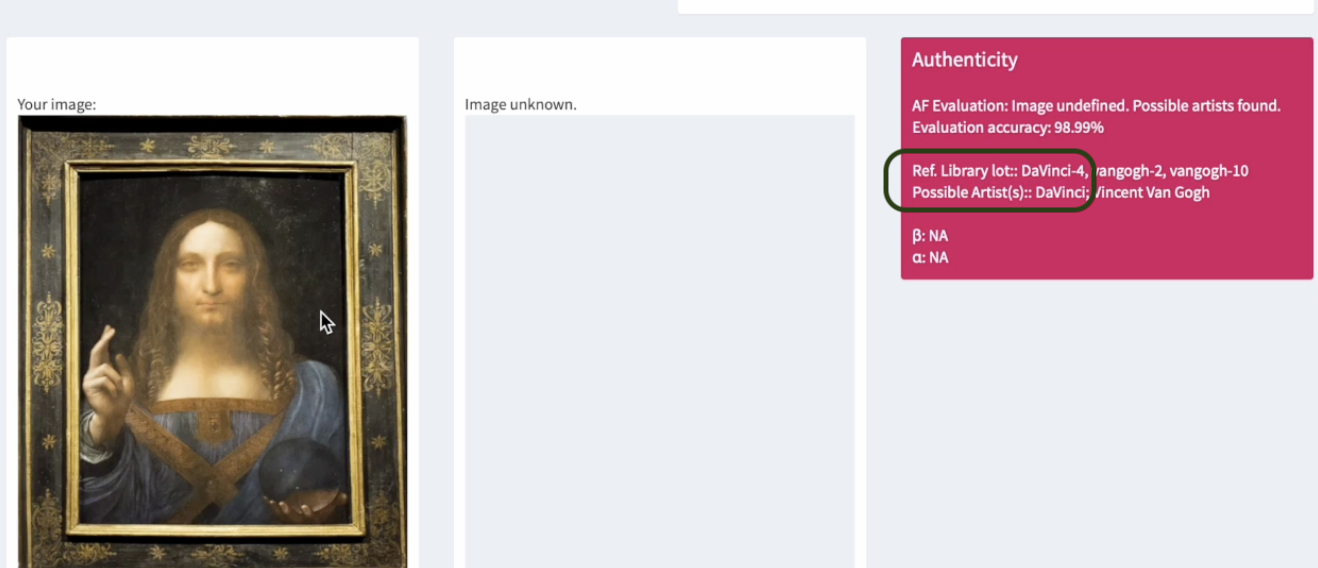 《救世主》Salvator Mundi 是历史上成交价最高的艺术作品于 2017 年 11 月在纽约以 4.503 亿美元的价格售出。尽管对于其作为达芬奇创作的真实性存在一些猜测,我们提交了来自拍卖清单的数字图像以验证达芬奇的印记的存在;请参见视频片段 1:05。
