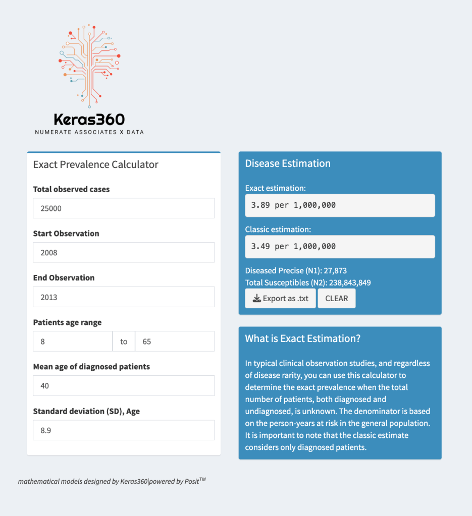 According to research conducted at Keras360 in January 2024, it can be asserted that the estimates generated by the calculator are more precise than those derived from conventional calculations for prevalence rates. The accompanying Table 1 illustrates this finding, as depicted in the featured image ( desktop page view; on the right). When a national disease registry is accessible and the diagnosis of a rare disease is firmly established, it enables the evaluation of the protocol estimation’s accuracy. It is important to note that most diseases necessitate time to manifest, and high-risk individuals may frequently remain undiagnosed until symptoms arise. This reasoning further elucidates why estimates for common chronic diseases tend to be underestimated when applying traditional methodologies. The undiagnosed category may effectively represent high-risk individuals who may have experienced little or no symptoms.